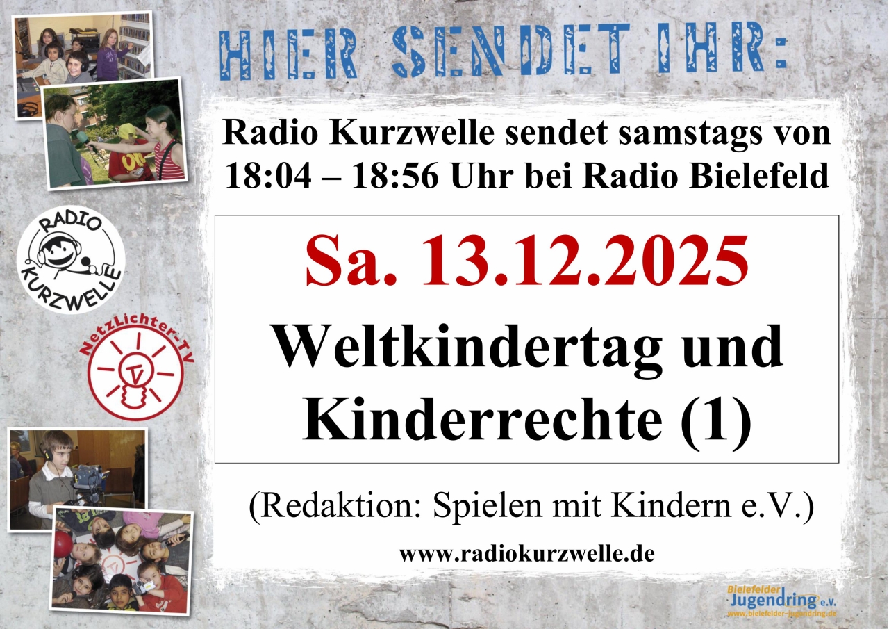 Kinderradio Kurzwelle sendet heute vom Spielfest zum Weltkindertag, was auf dem Klosterplatz in Bielefeld stattfand. Die Reporter*innen von Spielen mit Kindern e.V. berichten von den vielen Mitgliedseinrichtungen der Jugendarbeit in Bielefeld, die beim Spielfest dabei waren und Angebote zum Spielen und zu Kinderrechten machten. Im Interview mit Barbara Wildt vom Jugendring wird klar, das Kinderrechte immer gelten und die Meinung von Kindern genauso wichtig ist wie die von Erwachsenen. In der Kurzwelle Wissenslücke wird erklärt, warum es den Weltkindertag eigentlich gibt und wie er in anderen Ländern gefeiert wird.