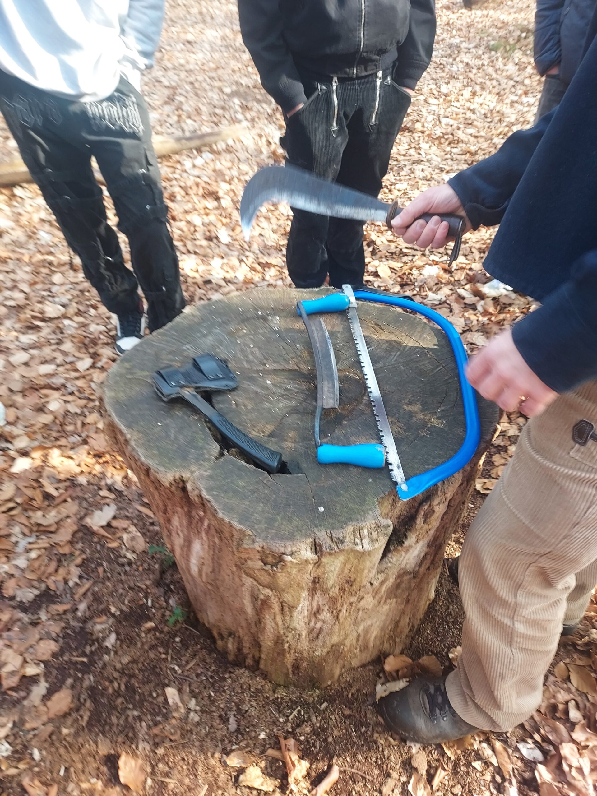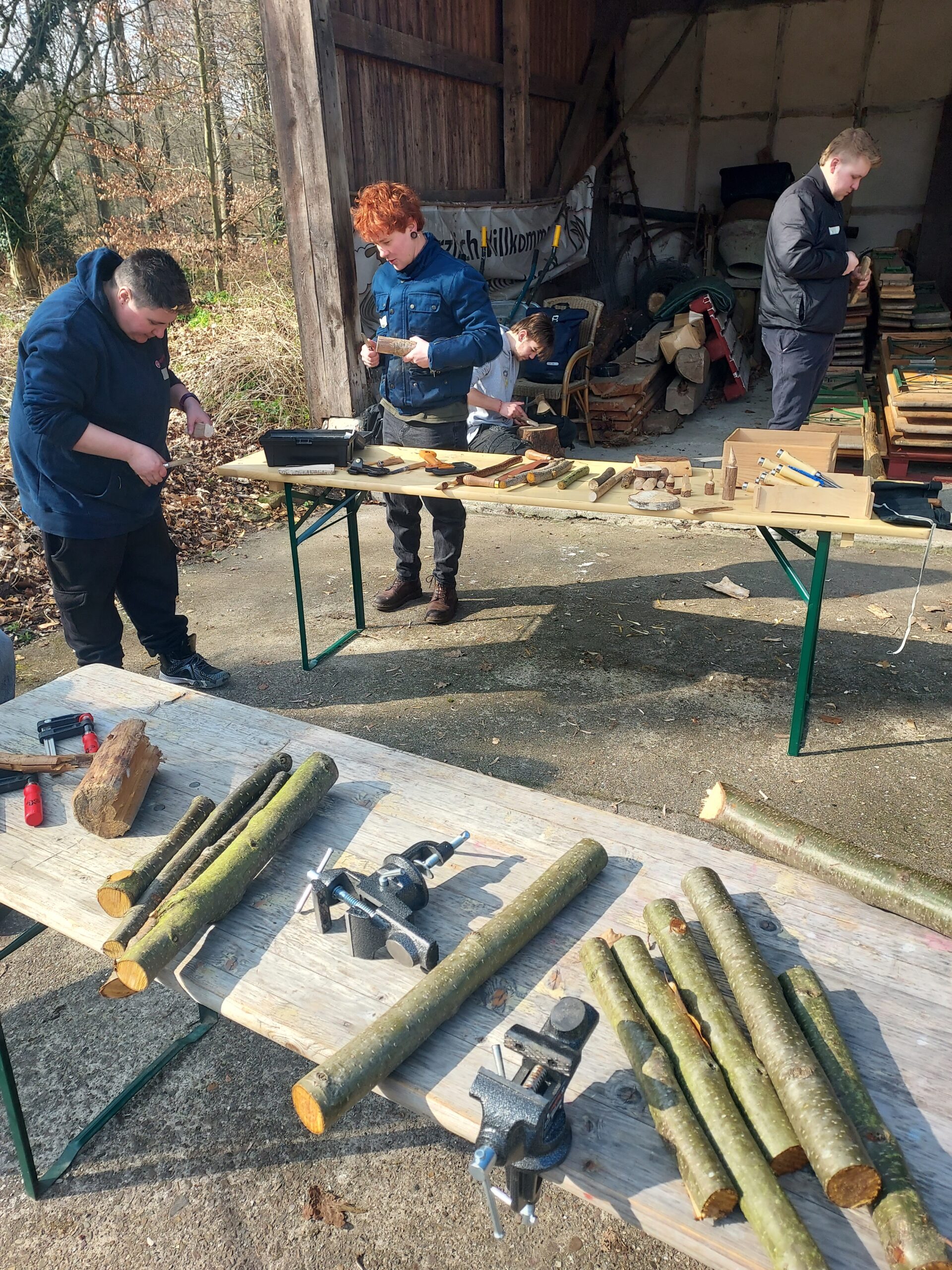 Unter super Anleitung von Jochen von der Waldjugend ging es darum, wie wir mit Kindern und Jugendlichen „Schnitz-Projekte“ durchführen können: Welche Werkzeuge sind wofür geeignet, wie geht der sichere Umgang damit, welche Holzarten kann man nehmen und woher kriegen wir überhaupt das Holz?